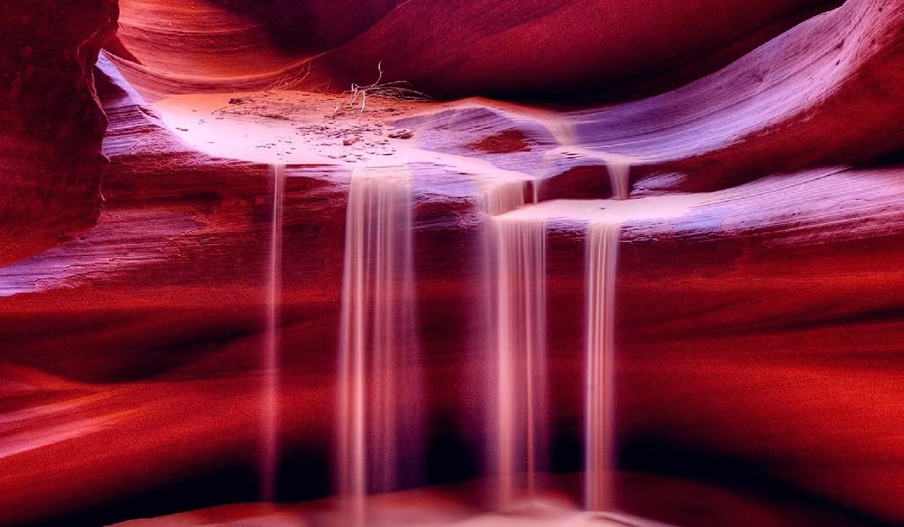 全天 下羚羊彩穴 Lower Antelope Canyon 下羚羊彩穴位于美国亚利桑纳州北方,是柔软的砂岩经过百万年的各种侵蚀力所形成。季风季节里常出现暴洪流入峡谷中,由于突然暴增的雨量,造成暴洪的流速相当快,加上狭窄通道将河道缩小,因此垂直侵蚀力也相对变大,形成了下羚羊彩穴底部的走廊,以及谷壁上坚硬光滑、如同流水般的边缘。下羚羊彩穴中没有任何人工照明,所有可见的光线均来自于峡谷顶部的裂缝,这些光线经过岩石纹理的反复折射 进入谷底,产生出梦幻般不规则的色彩变化,这些色彩由深至浅,七彩斑斓,美轮美奂。