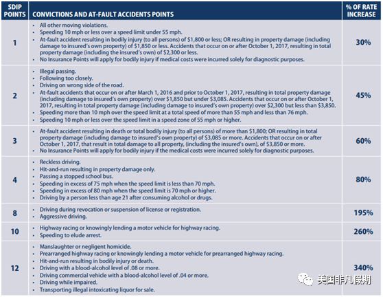 北卡安全驾驶激励计划(Safe Driver Incentive Plan, 简称SDIP)用降低保险费率的方式来激励州内居民安全驾驶,每项交通违规行为都有一个点值,每增加一个记录点,你的保险费就会增加。(2017年10月1日之后标准,如下图所示,来源:NCDOI,北卡保险厅)——